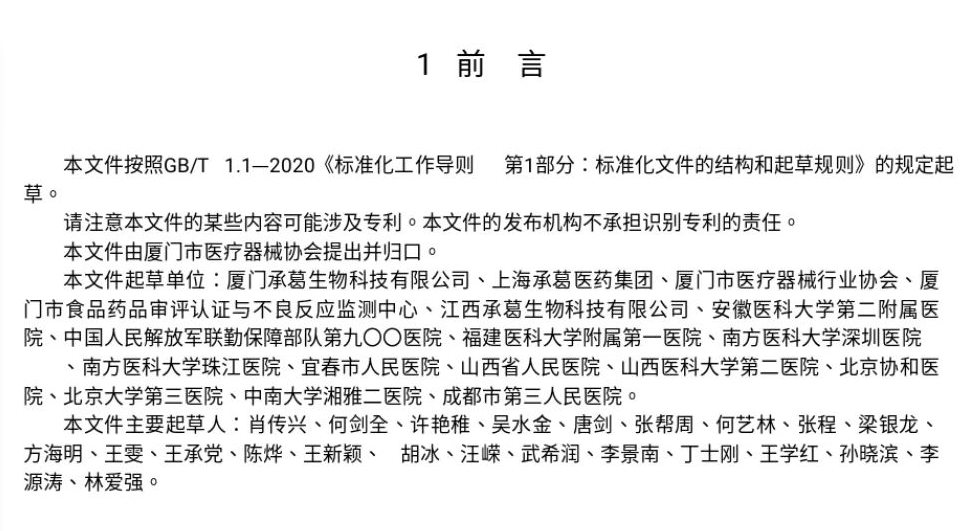 據(jù)了解,五項團體標準是由上海承葛醫(yī)藥集團牽頭起草,聯(lián)合廈門承葛生物科技有限公司、廈門市醫(yī)療器械行業(yè)協(xié)會、廈門市食品藥品審評認證與不良反應監(jiān)測中心、江西承葛生物科技有限公司、安徽醫(yī)科大學第二附屬醫(yī)院、中國人民解放軍聯(lián)勤保障部隊第九00醫(yī)院、福建醫(yī)科大學附屬第一醫(yī)院、南方醫(yī)科大學深圳醫(yī)院、南方醫(yī)科大學珠江醫(yī)院、宜春市人民醫(yī)院、山西省人民醫(yī)院、山西醫(yī)科大學第二醫(yī)院、北京協(xié)和醫(yī)院、北京大學第三醫(yī)院、中南大學湘雅二醫(yī)院、成都市第三人民醫(yī)院等16家單位參與制定。承葛醫(yī)藥集團董事長肖傳興作為標準主要起草人之一。