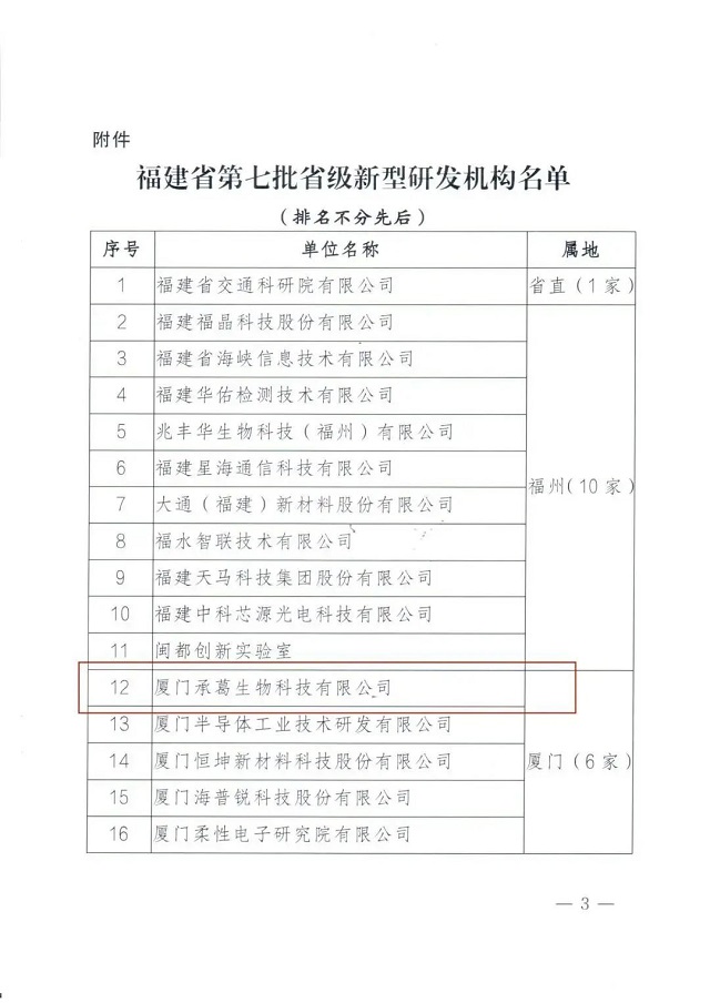 近日,福建省科技廳公布福建省第七批省級新型研發(fā)機構(gòu)名單。經(jīng)過評審,廈門承葛生物科技有限公司(簡稱“承葛生物”)被確立為福建省第七批省級新型研發(fā)機構(gòu)。本批次全省共36家單位(其中廈門市6家)獲得此榮譽。通過評審,廈門承葛生物科技有限公司(簡稱“承葛生物”)被確立為福建省第七批省級新型研發(fā)機構(gòu)。這是承葛生物繼2021年獲得廈門市新型研發(fā)機構(gòu)稱號后,在技術(shù)研發(fā)、創(chuàng)新創(chuàng)業(yè)方面再次獲得相關(guān)部門和社會的認可。