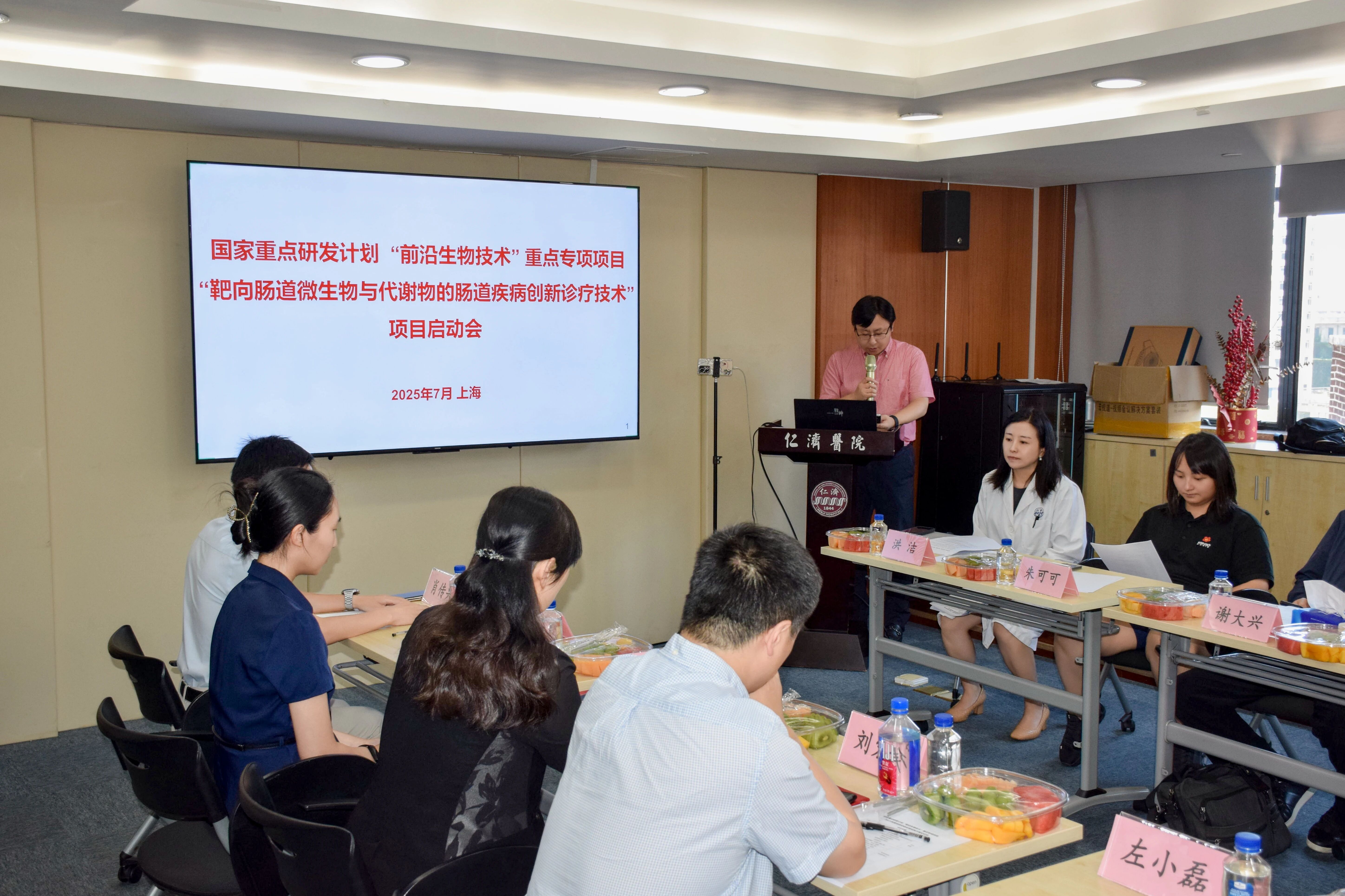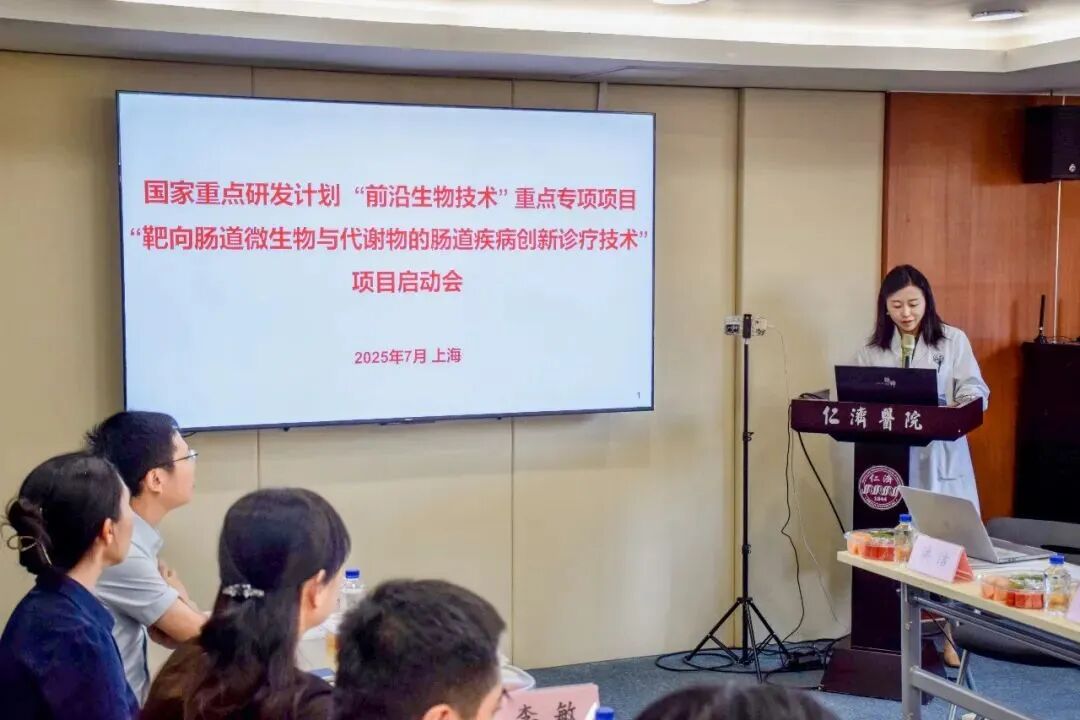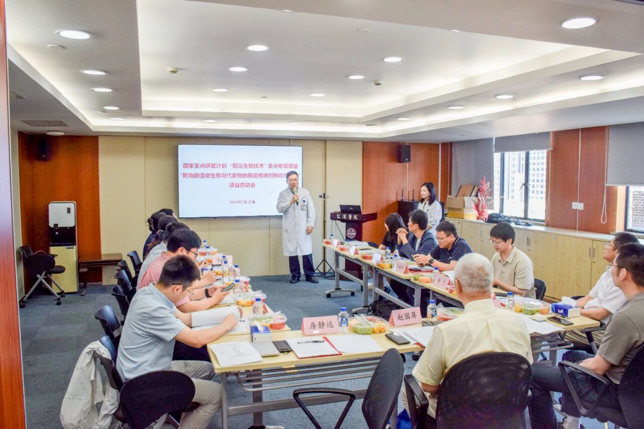 人體腸道微生物組作為“第二基因組”、“第八大器官”,其失衡與人體消化、代謝、腫瘤等眾多疾病的發(fā)生發(fā)展密切相關(guān),靶向調(diào)控腸道菌群與代謝物已成為人類重大疾病、慢病的創(chuàng)新型診療策略。為響應(yīng)國家在前沿生物技術(shù)領(lǐng)域的重大戰(zhàn)略布局,推動(dòng)腸道疾病診療技術(shù)的源頭創(chuàng)新與臨床轉(zhuǎn)化,上海交通大學(xué)醫(yī)學(xué)院附屬仁濟(jì)醫(yī)院牽頭,聯(lián)合清華大學(xué)、上海交通大學(xué)醫(yī)學(xué)院附屬瑞金醫(yī)院、華中科技大學(xué)、承葛醫(yī)藥等共同申報(bào)的國家重點(diǎn)研發(fā)計(jì)劃“前沿生物技術(shù)”重點(diǎn)專項(xiàng)——“靶向腸道微生物與代謝物的腸道疾病創(chuàng)新診療技術(shù)”項(xiàng)目斬獲國家衛(wèi)健委立項(xiàng)資助。(上海交通大學(xué)醫(yī)學(xué)院附屬仁濟(jì)醫(yī)院 洪潔教授)2025年7月3日,項(xiàng)目啟動(dòng)會(huì)在仁濟(jì)醫(yī)院隆重舉行。出席本次會(huì)議的有:上海市科委生命科技處二級(jí)主任科員孫振杰、仁濟(jì)醫(yī)院科研處左小磊處長、項(xiàng)目指導(dǎo)專家組趙國屏院士(中國科學(xué)院分子植物科學(xué)卓越創(chuàng)新中心)、房靜遠(yuǎn)教授(上海交通大學(xué)醫(yī)學(xué)院附屬仁濟(jì)醫(yī)院)、廖專教授(第二軍醫(yī)大學(xué)附屬長海醫(yī)院)、劉雙江教授(山東大學(xué))、楊弋教授(華東理工大學(xué))、劉宏偉研究員(中國科學(xué)院微生物研究所)、王桂華教授(華中科技大學(xué)同濟(jì)醫(yī)學(xué)院附屬同濟(jì)醫(yī)院)、李敏教授(上海交通大學(xué)醫(yī)學(xué)院附屬仁濟(jì)醫(yī)院)、周宏偉教授(南方醫(yī)科大學(xué)深圳醫(yī)院)、黃成軍教授(中國科學(xué)院微電子研究所)等專家學(xué)者。(項(xiàng)目啟動(dòng)會(huì)全體參會(huì)人員合影)