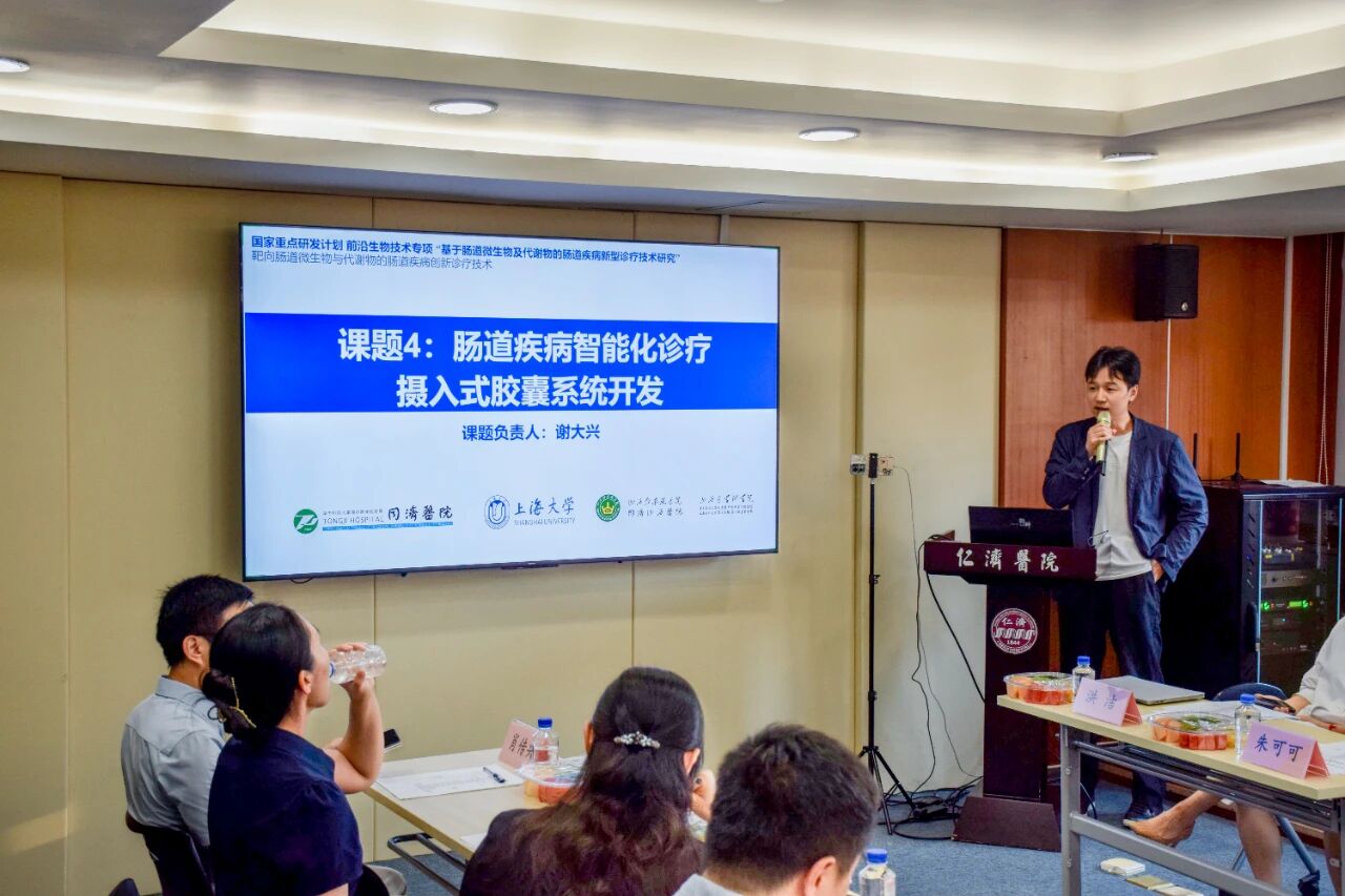 課題四負(fù)責(zé)人、華中科技大學(xué)同濟(jì)醫(yī)學(xué)院附屬同濟(jì)醫(yī)院謝大興教授匯報(bào)了課題實(shí)施方案,其核心任務(wù)是完成腸道疾病智能化診療攝入式膠囊系統(tǒng)開發(fā)。