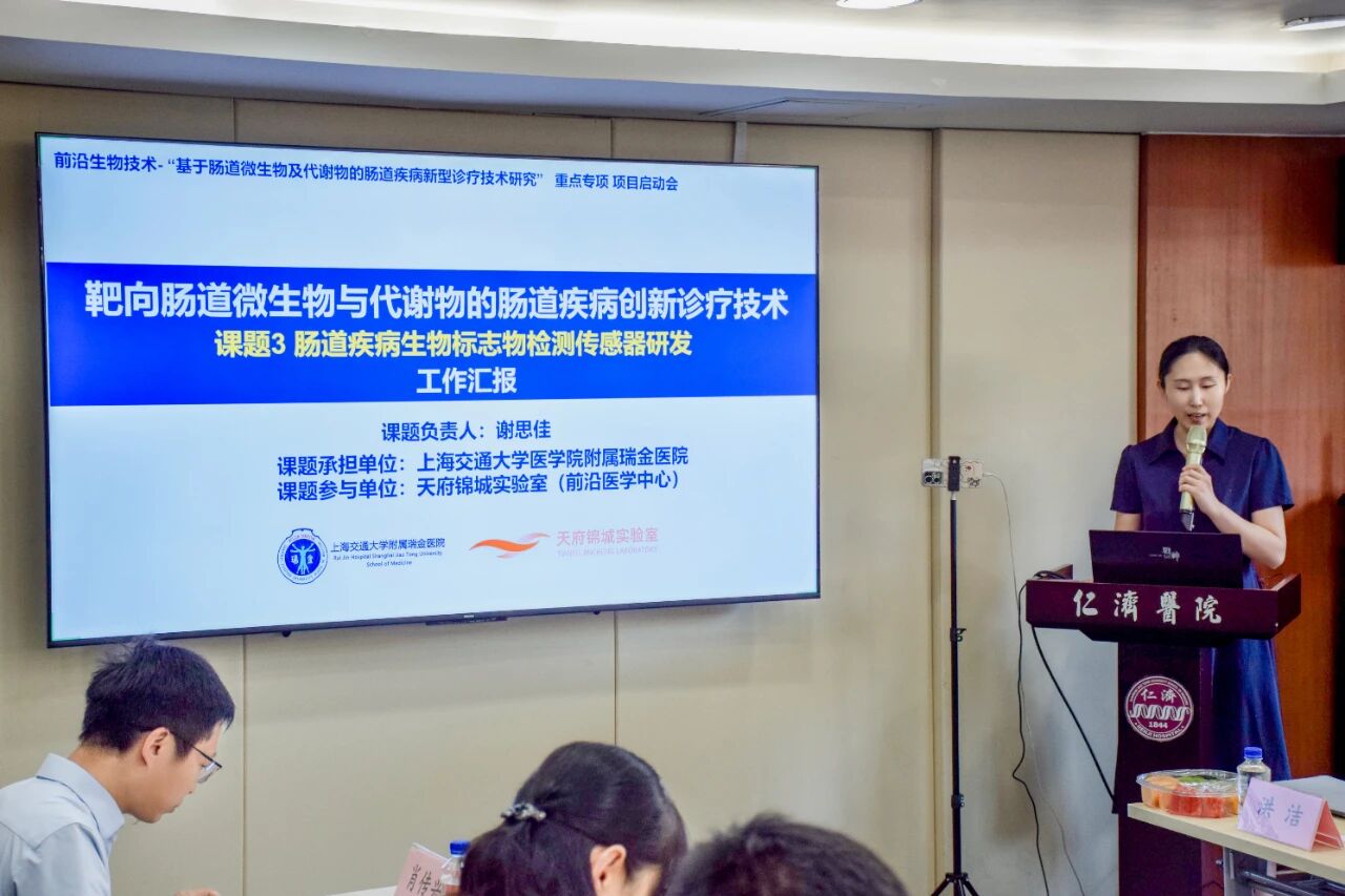 課題三負(fù)責(zé)人、上海交通大學(xué)醫(yī)學(xué)院附屬瑞金醫(yī)院醫(yī)學(xué)芯片研究所PI謝思佳研究員匯報(bào)了課題實(shí)施方案,重點(diǎn)介紹腸道疾病生物標(biāo)志物檢測傳感器研發(fā)。