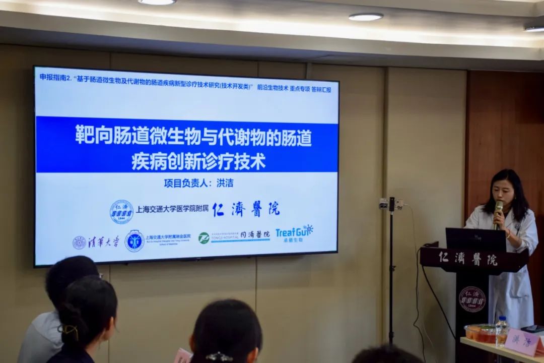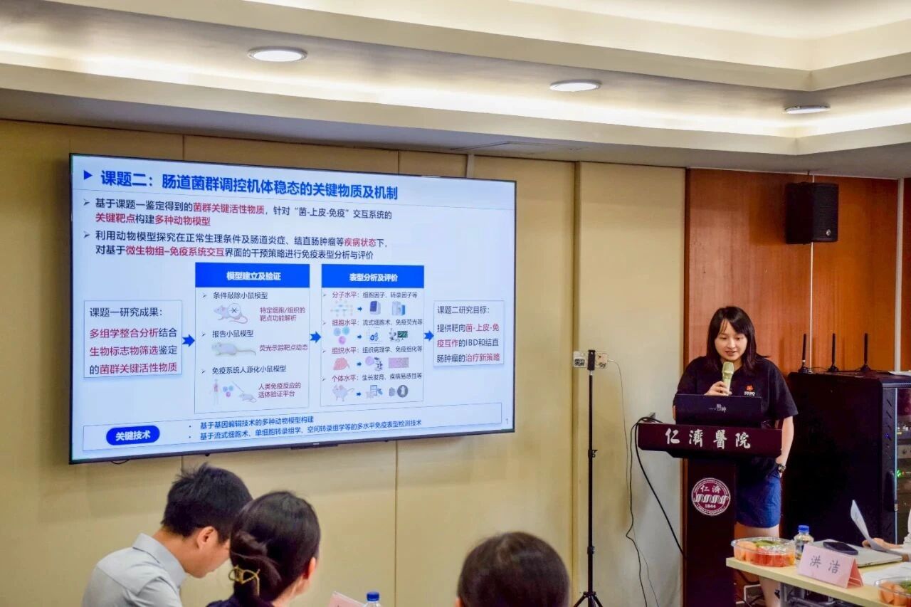 在簡短的休息與合影留念后,會(huì)議進(jìn)入核心環(huán)節(jié)——項(xiàng)目及課題實(shí)施方案匯報(bào)與論證。項(xiàng)目負(fù)責(zé)人兼課題一負(fù)責(zé)人洪潔教授首先匯報(bào)了項(xiàng)目的整體實(shí)施方案,系統(tǒng)闡述了項(xiàng)目的核心目標(biāo)、研究內(nèi)容、技術(shù)路線和創(chuàng)新點(diǎn),勾勒出通過靶向腸道菌群與代謝物革新腸道疾病診療技術(shù)的宏偉藍(lán)圖。